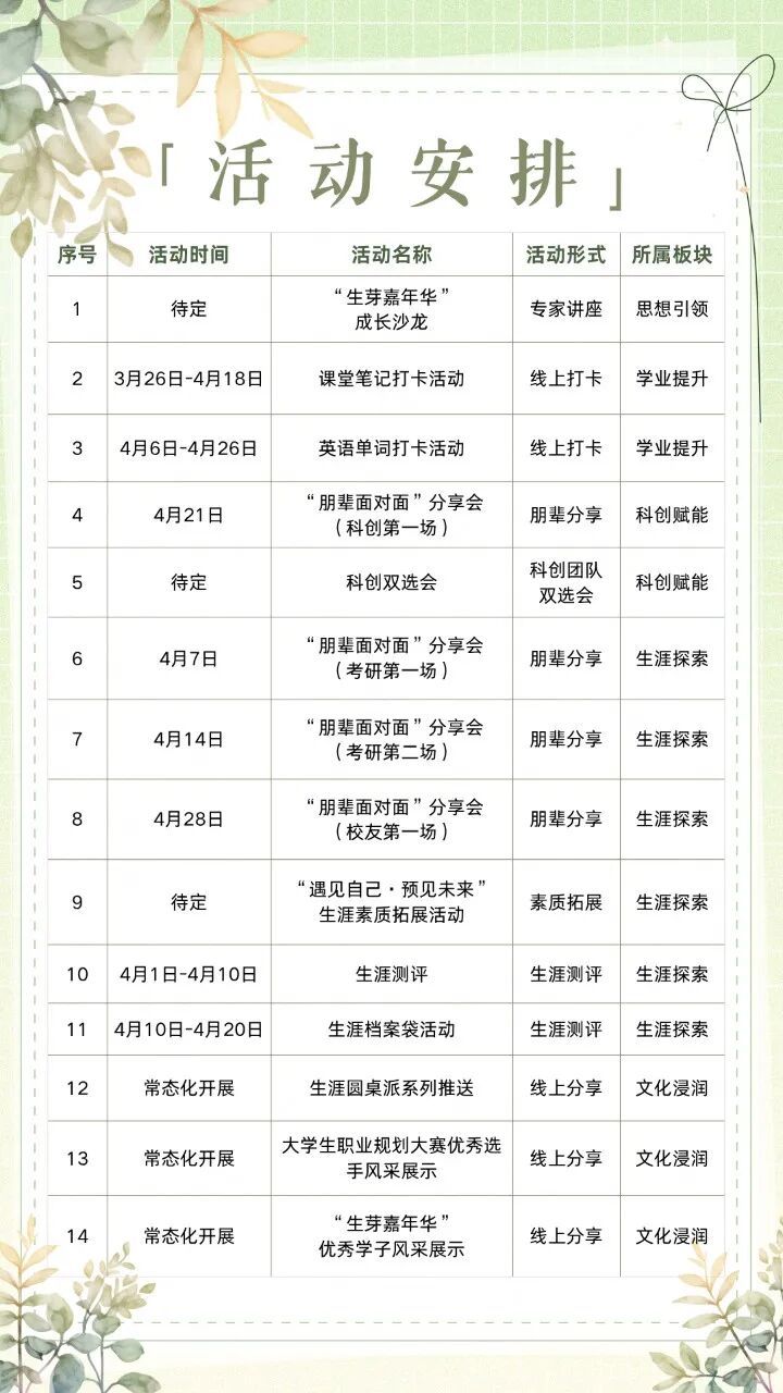 活动共分为“思想领航-学业提升-科创赋能-生涯探索-文化浸润”五个版块。立足不同专业、不同学段学生的生涯发展需求,切实服务学生学业成长与生涯发展。